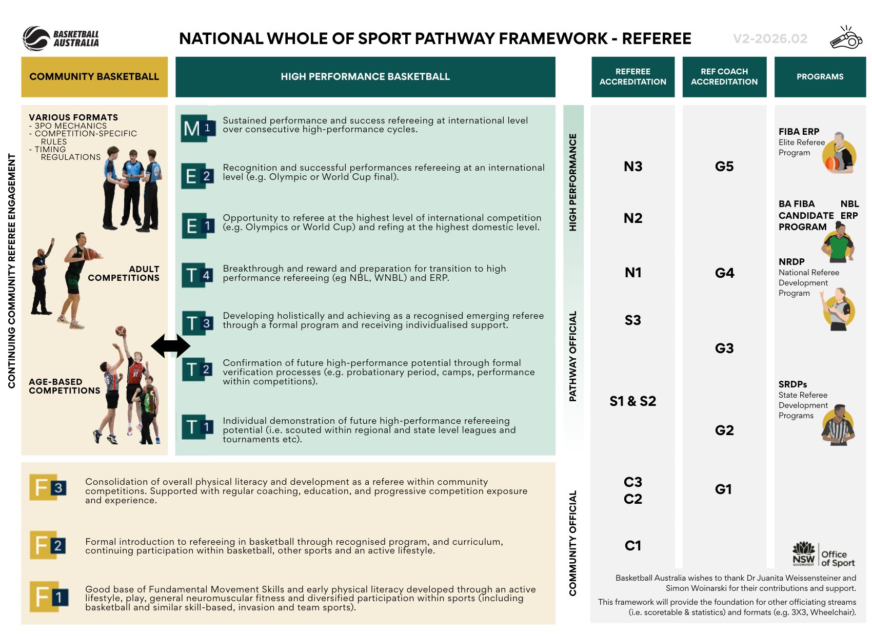 The FTEM-O framework provides a clear, structured pathway for officiating development in basketball, from entry-level community officiating to elite international performance. FTEM-O recognises that officials, like players, require long-term support, progressive skill development, and targeted opportunities to advance.
